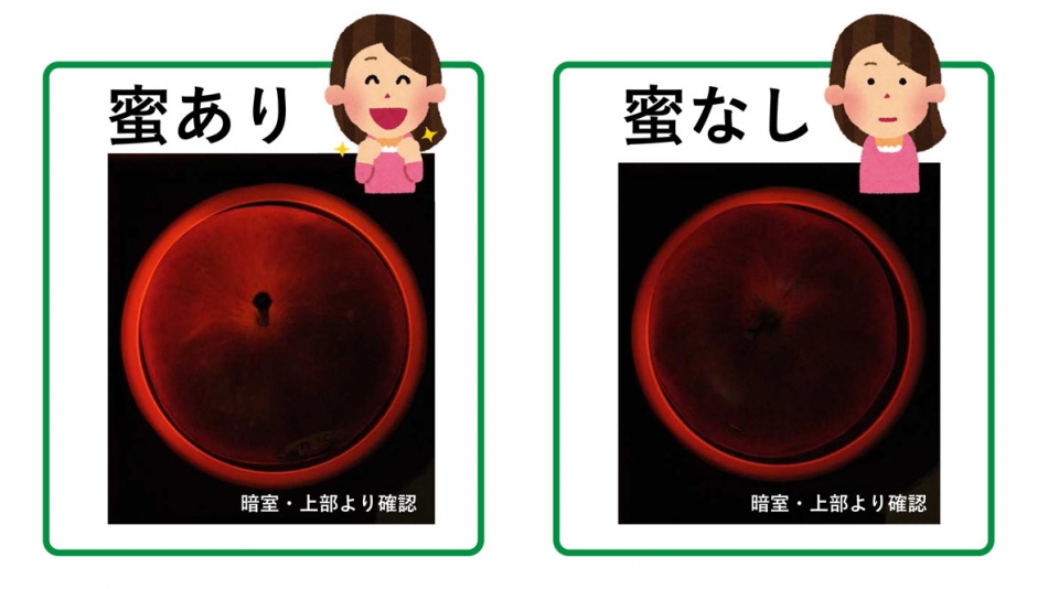 蜜入りの場合は図のように光が通り、リンゴ全体が明るく見えます。
